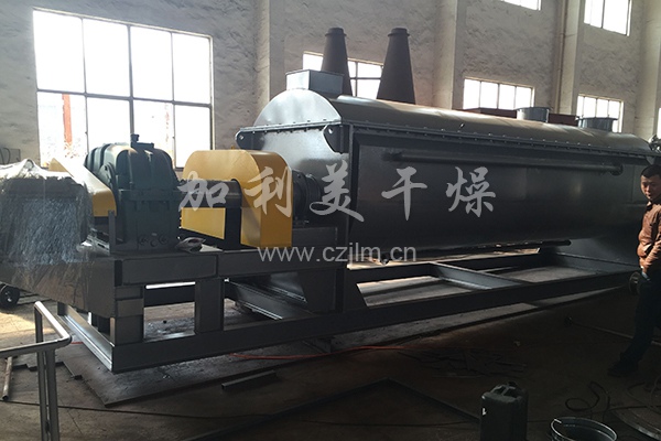 空心軸上密集排列著楔型中空槳葉,熱介質經空心軸流經槳葉。單位有效容積內傳熱面積很大,熱介質溫度從-40℃到320℃,可以是水蒸汽,也可以是液體型:如熱水、導熱油等。間接傳導加熱,沒有攜帶空氣帶走熱量,熱量均用來加熱物料。熱量損失僅為通過器體保溫層向環境的散熱。楔型 槳葉傳熱面具有自清潔功能。物料顆粒與楔型面的相對運動產生洗刷作用,能夠洗刷掉楔型面上附著物料,使運轉中一直保持著清潔的傳熱面。槳葉干燥機的殼體為W型,殼體內一般安排二到四根空心攪拌軸。殼體有密封端蓋與上蓋,防止物料粉塵外泄及收集物料溶劑蒸汽。出料口處設置一擋扳,保證料位高度,使傳熱面被物料覆蓋而充分發揮作用。熱介質通過旋轉接頭,流經殼體夾套及空心攪拌軸,空心攪拌軸依據熱介質的類型而具有不同的內部結構,以保證好的傳熱效果。