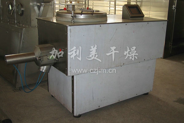 粉體物料與粘合劑在圓筒形容器中由底部混合漿充分混合成濕潤軟材,然后由側置的高速粉碎槳切割成均勻的濕顆粒。